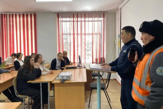 19 ақпанда «Саумалкөл №1 орта мектеб» КММ-де 10 сынып оқушыларымен және полиция аға сержанты М.А. Кәкімбековпен